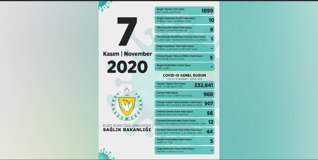 Sağlık Bakanı Dr. Ali Pilli, son 24 saatte  yapılan test sayısının 1899 olduğunu, 10 pozitif vakaya  rastlandığını , 5 kişinin taburcu edildiğini açıkladı.