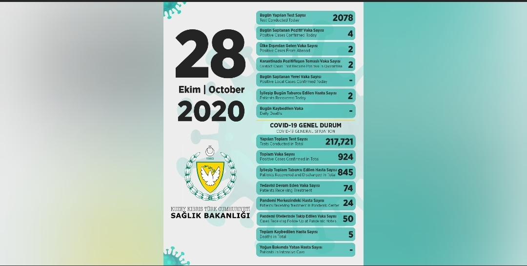 Sağlık Bakanı Dr. Ali Pilli, son 24 saatte yapılan test sayısının 2078 olduğunu, 4 pozitif vakaya rastlandığını, 2 kişinin taburcu edildiğini açıkladı.