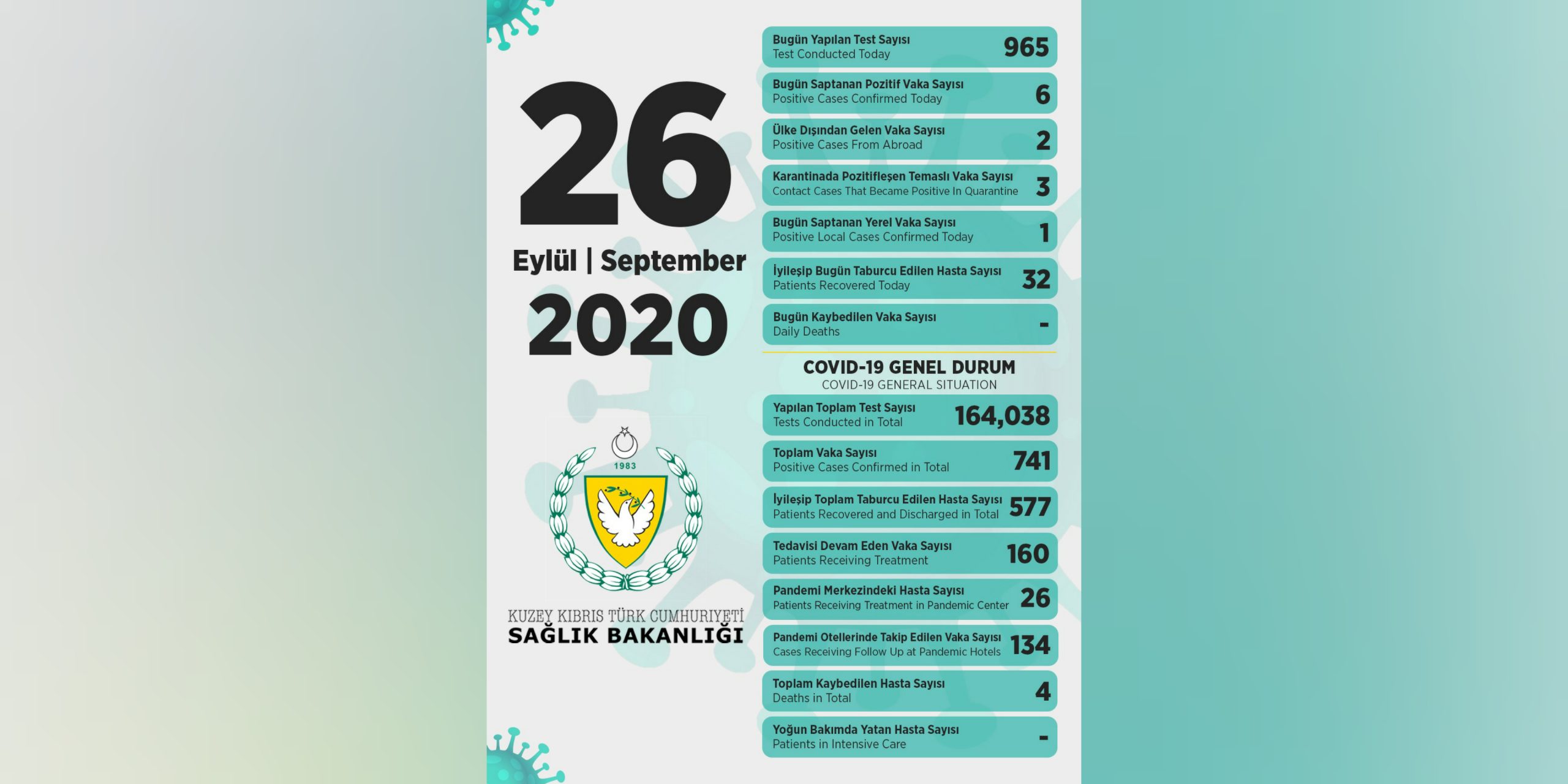 26 Eylül 2020 Covid-19 genel durumu şöyle;