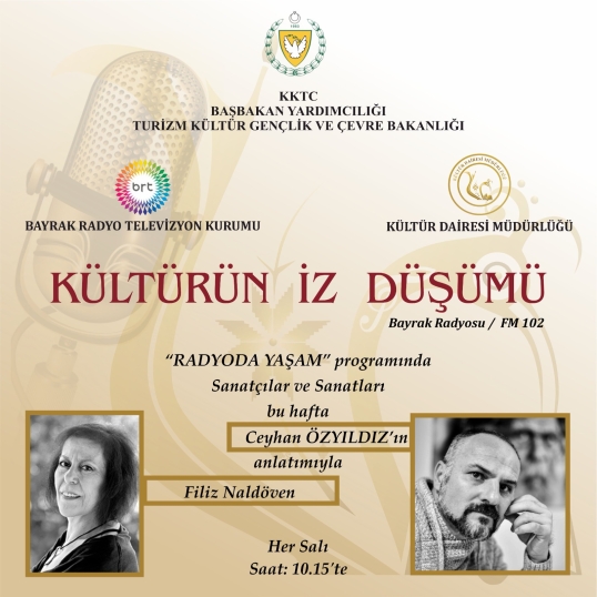 Bayrak Radyosu’nda, Radyoda Yaşam isimli programda, haftada bir salı günleri saat 10.15’te yayınlanan Kültürün İz Düşümü isimli bölümde bu hafta (26 Temmuz Salı) Şair Filiz Naldöven tanıtılıyor. Kültürün ajandası ile başlayan bu bölümde Kültür Dairesi Kültür Merkezi Yönetmenleri Pervin Aremek ve Ceyhan Özyıldız Kültür Dairesi’nin etkinlikleri hakkında bilgi verip ülke sanatçılarını tanıtarak eserlerinden örnekler paylaşıyorlar.