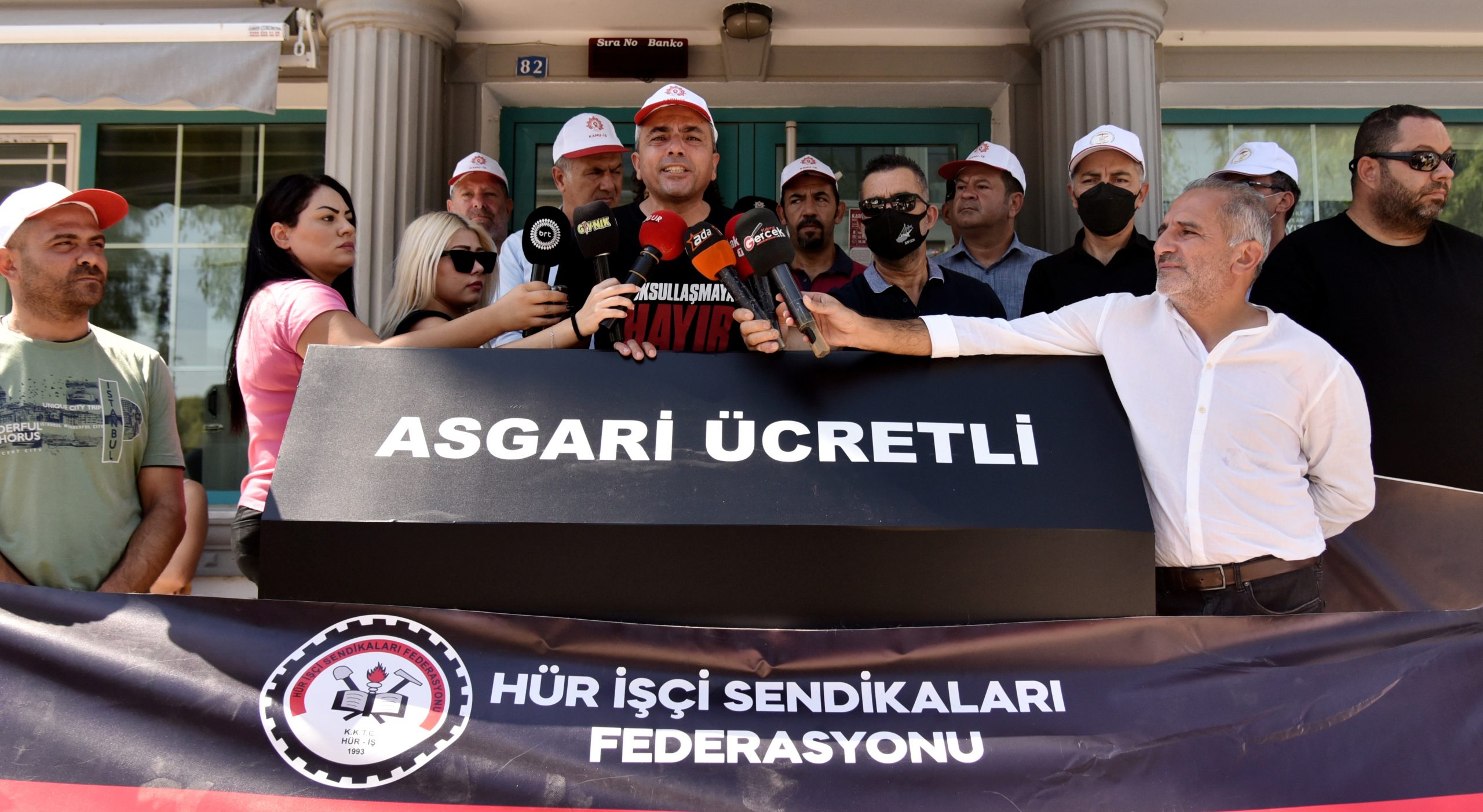 Asgari Ücret Saptama Komisyonu’nda işçi tarafını temsil eden Hür-İş’e bağlı sendikaların temsilcileri ile KTAMS, KAMU-SEN, KTÖS, KTOEÖS, KOOP-SEN, DEV-İŞ’in yer aldığı eyleme, “Halk Cephesi Grubu” temsilcileri de katıldı. Eylemde ilk olarak Hür-İş Başkanı Ahmet Serdaroğlu, basına açıklamalarda bulundu.