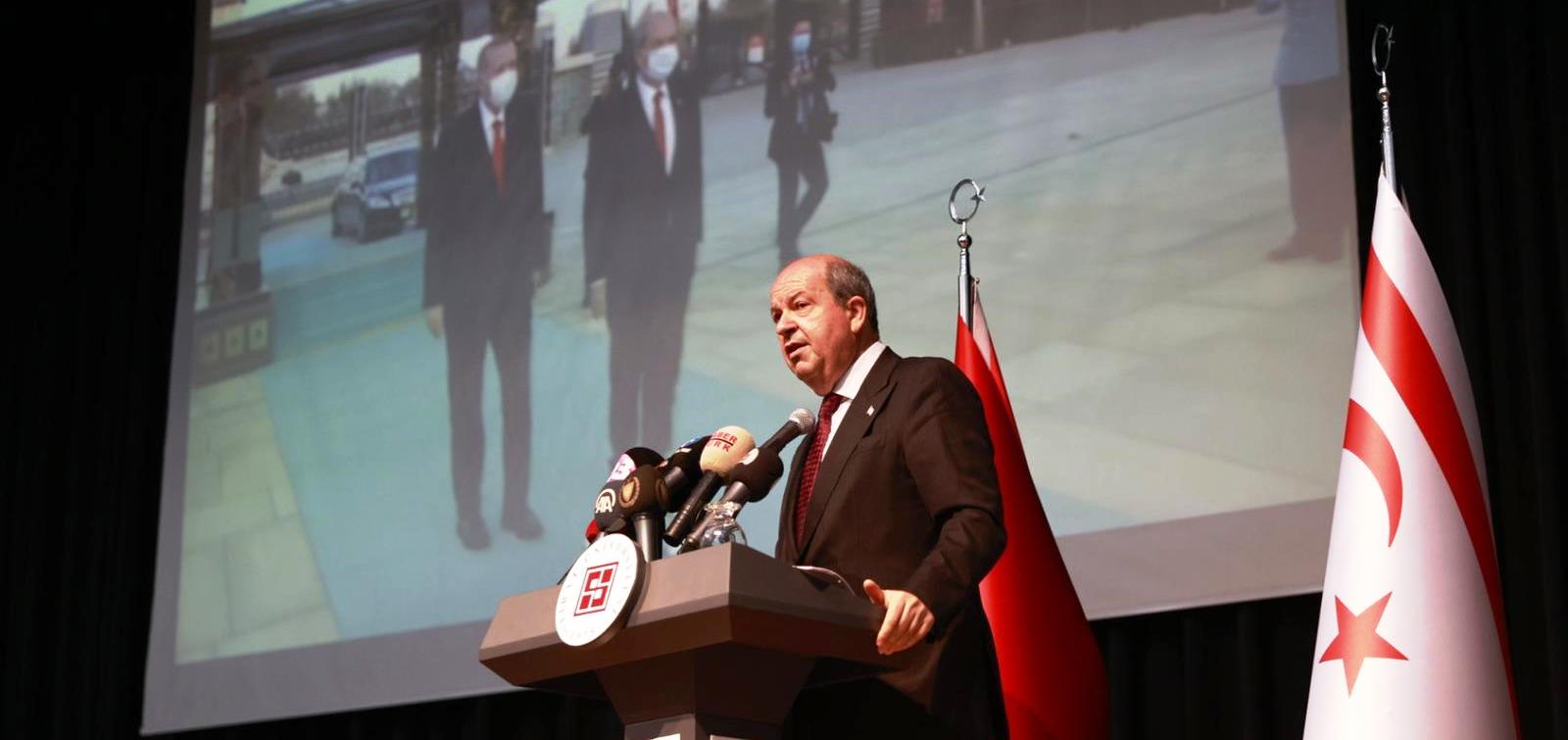 Cumhurbaşkanı Ersin Tatar, verdiği konferansta, 1571 yılında Kıbrıs’ın fethedilmesinden başlayarak günümüze kadar gelen süreçte yaşananları anlattı. Konuşmasında müzakere süreçlerine de değinen Tatar, “BM Güvenlik Konseyi’nin 4 Mart 1964 tarihinde almış olduğu haksız ve siyasi bir kararla Rum devletine dönüşen Kıbrıs Cumhuriyeti’ni ‘Kıbrıs’ın tek meşru hükümeti’ olarak tanınırken, Rum liderliği Kıbrıs Türk halkını diz çöktürebilmek için zaman oynadı. Rum tarafının bu tutumu hâlâ devam ederken, BM parametrelerinin özünü teşkil eden BM Güvenlik Konseyi’nin bu kararı hâlâ çözümün önündeki en büyük engeldir. Bunlar ortadan kalkmadıkça da Rum tarafı hiçbir zaman adil ve kalıcı bir anlaşmaya yanaşmayacaktır” ifadelerini kullandı.