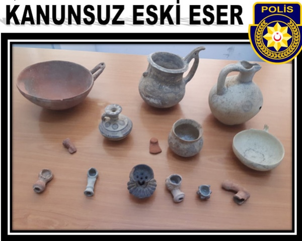 Polis Basın Bülteni’ne göre, dün M.E’nin (E-64) ikametgâhında yapılan aramada, tasarrufunda arkeolojik nitelikli eski eser olduğuna inanılan 1 adet oinochoe, toprak renk kase, küçük boy bardak, sürahi, süt kasesi, üzengi kulplu testi ve 6 adet pipo bulundu.