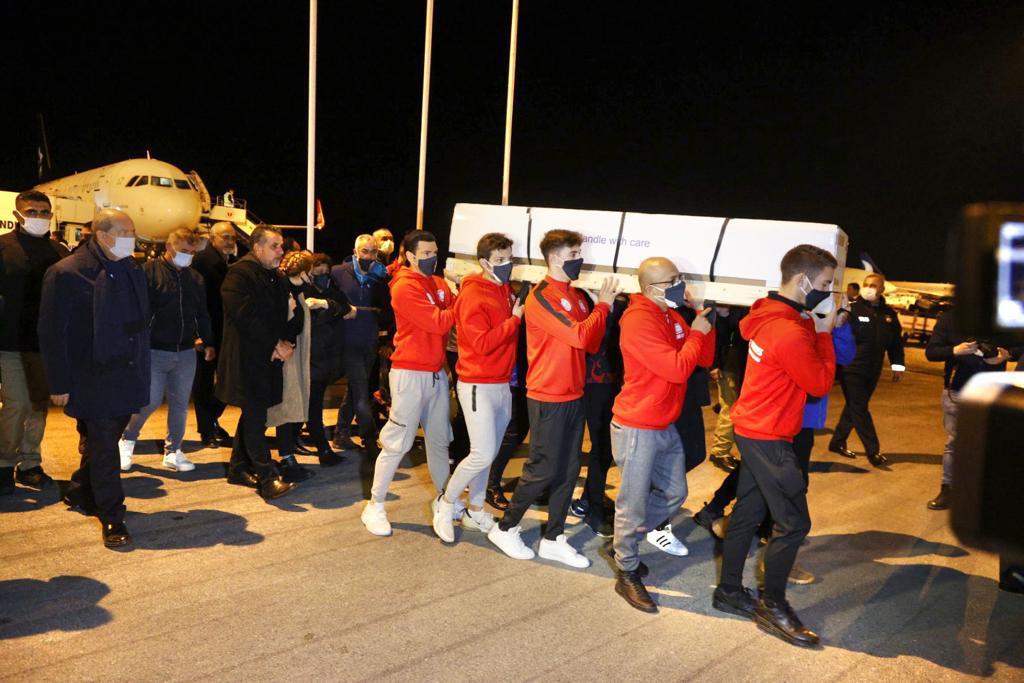 Birkan Uzun’un naaşı 10 milli sporcu tarafından uçaktan alınarak cenaze nakil aracına taşındı.