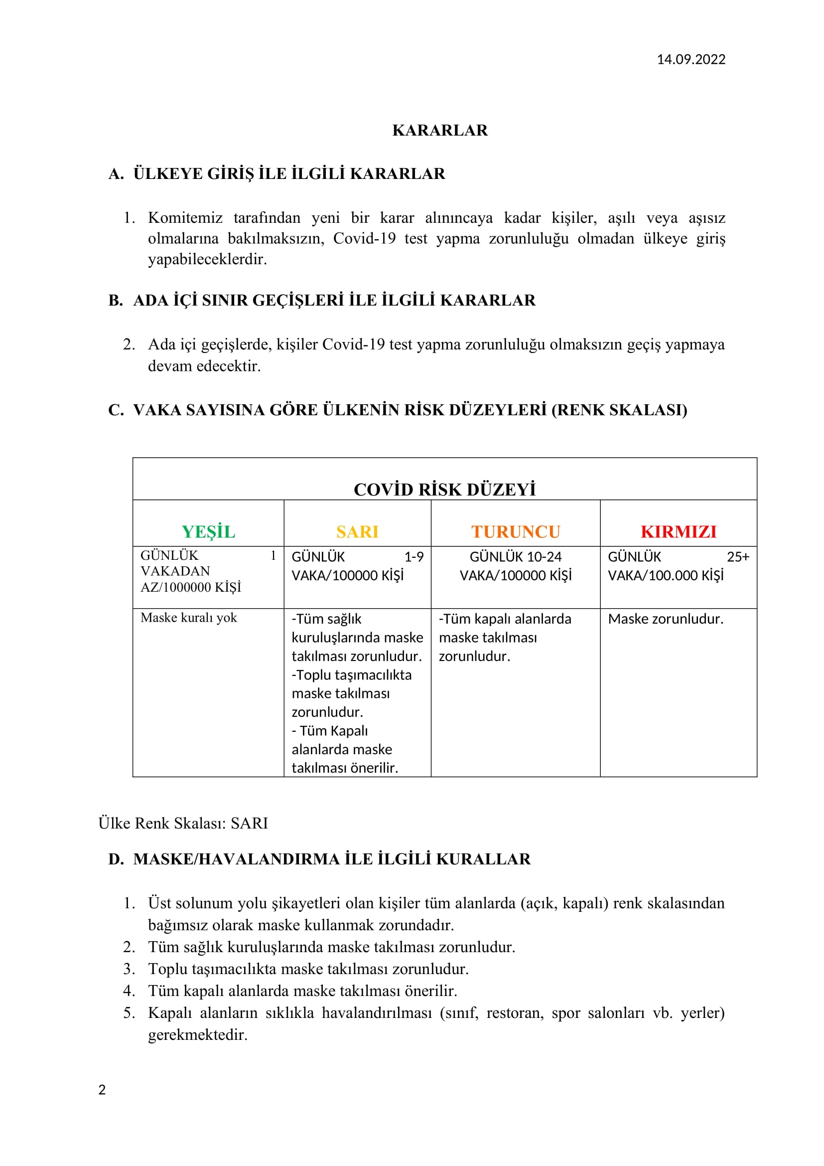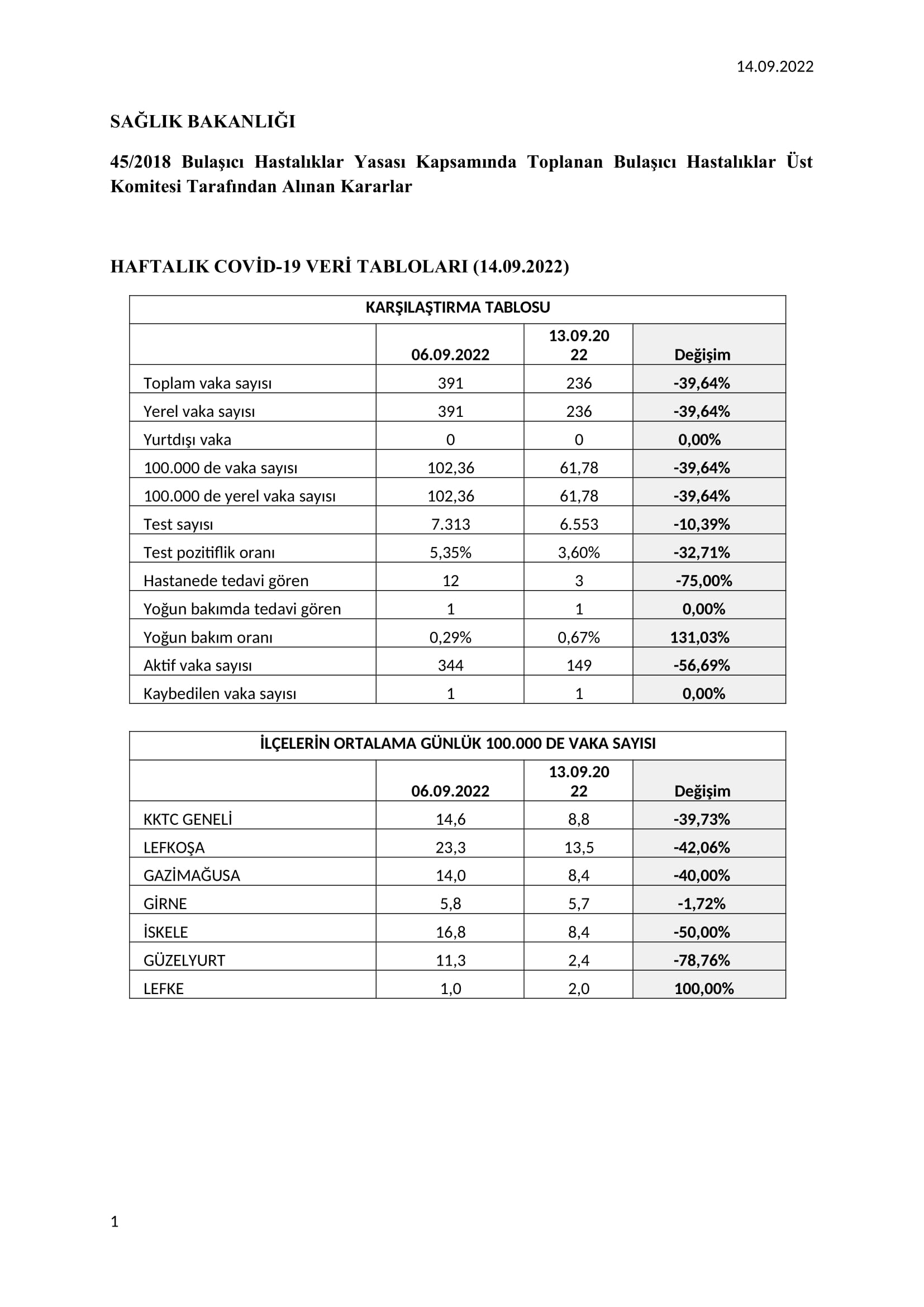 Kararlarda yer alan güncel verilere göre, son bir haftada, ülkedeki toplam vaka sayısında yüzde 36,64’lük bir düşüş gözlemlendi. 6 Eylül’de açıklanan haftalık verilere göre 391 olan toplam vaka sayısı, 13 Eylül’deki haftalık vaka sayısı tablosuna göre 236’ya düştü. Test pozitiflik oranı ise son bir haftada 5,35’ten 3,60’a düştü. Vaka sayısına göre ülkenin risk düzeyinin “sarı” olduğu belirtildi.