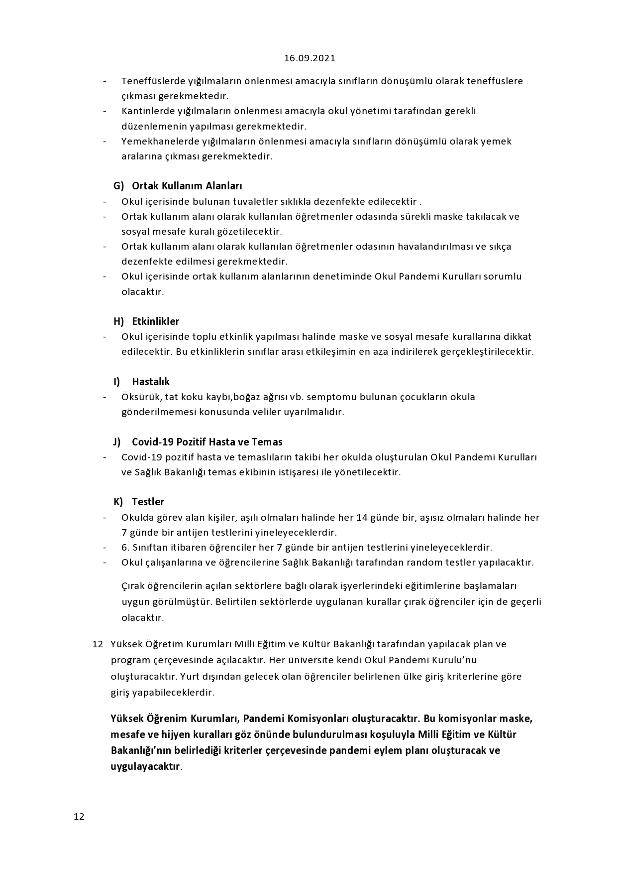 Yüksek Öğrenim Kurumları, Pandemi Komisyonları oluşturacak ve bu komisyonlar maske, mesafe ve hijyen kuralları göz önünde bulundurulması koşuluyla Milli Eğitim ve Kültür Bakanlığı’nın belirlediği kriterler çerçevesinde pandemi eylem planı oluşturacak ve uygulayacak.