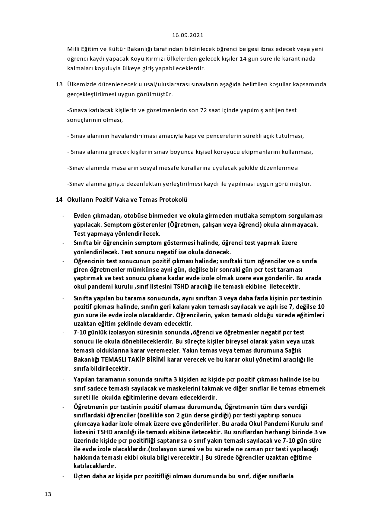 Öğrencinin test sonucunun pozitif çıkması halinde; sınıftaki tüm öğrenciler ve o sınıfa giren öğretmenler mümkünse ayni gün, değilse bir sonraki gün PCR test taraması yaptırmak ve test sonucu çıkana kadar evde izole olmak üzere eve gönderilecek.