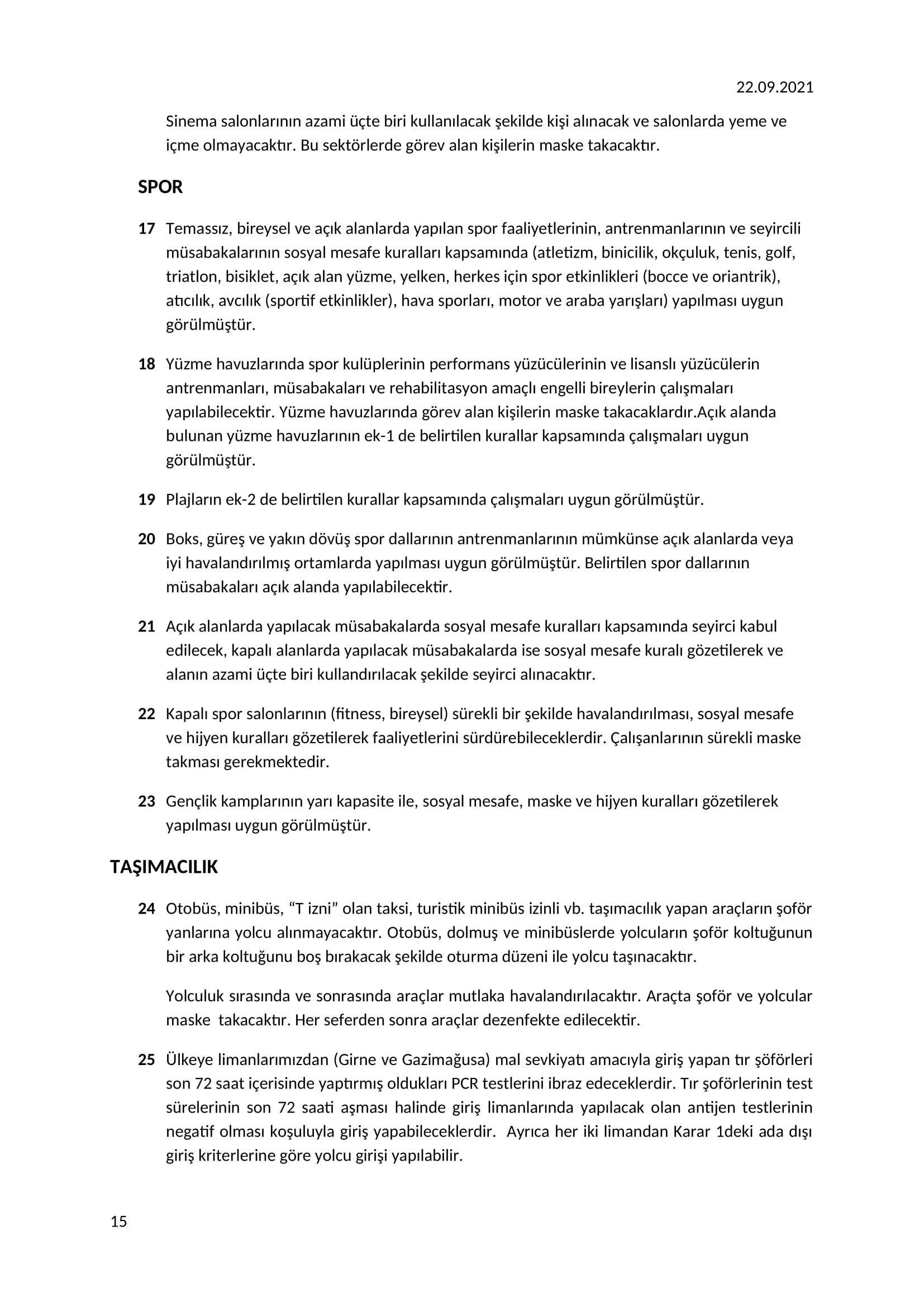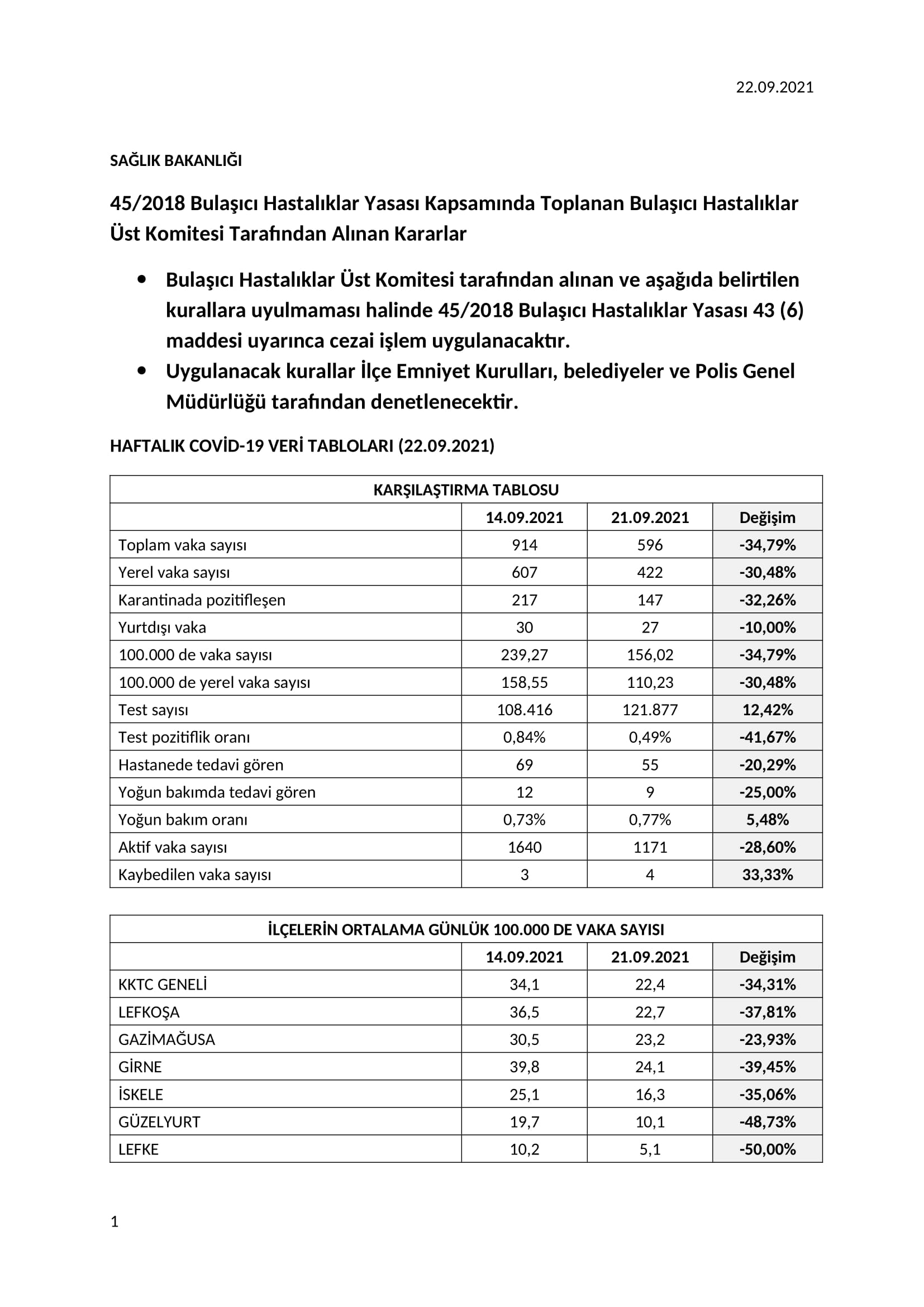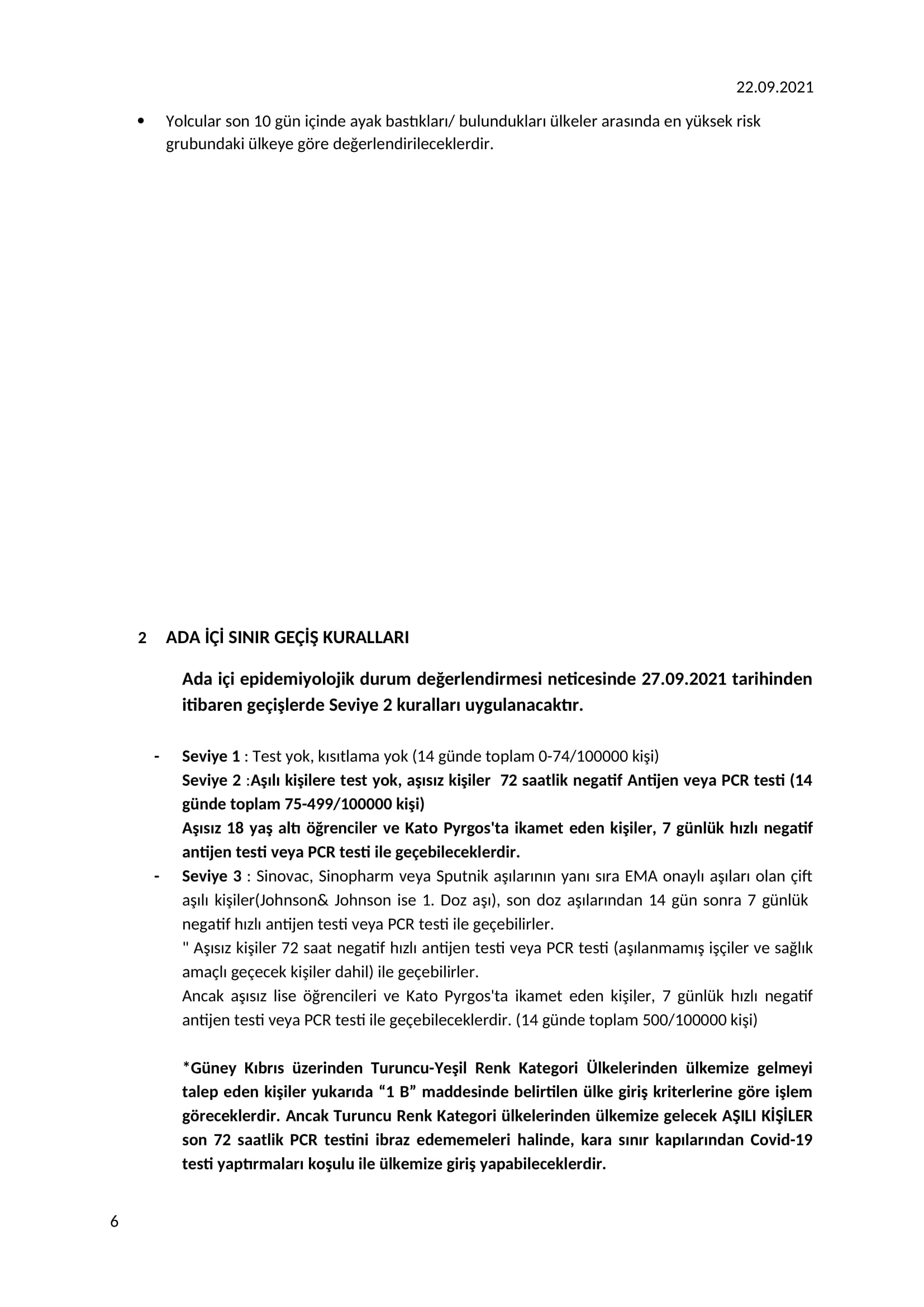 Üst Kurul, Ada içi epidemiyolojik durum değerlendirmesi neticesinde 27 Eylül pazartesi gününden karşılıklı geçişlerde Seviye 2 kuralları uygulanacağını da anımsattı.Buna göre aşılı kişiler test yapmadan karşılıklı geçiş yapabilecek… Aşısız kişilerden ise 72 saatlik negatif antijen veya PCR testi sonucu istenecek.Aşısız 18 yaş altı öğrenciler ve Kato Pyrgos’ta ikamet eden kişiler, 7 günlük hızlı negatif antijen testi veya PCR testi ile geçiş yapabilecek.