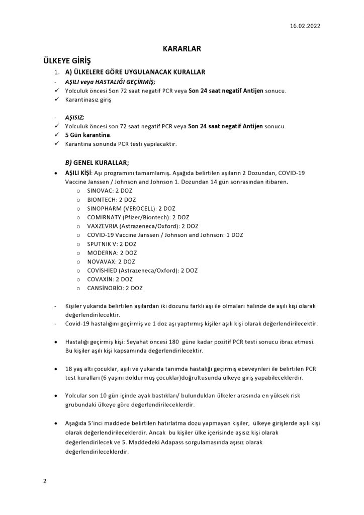 Kararlara göre, 18 yaş altı kişiler, hatırlatma dozu aranmaksızın ikinci doz aşısının üzerinden (Johnson için tek doz) 14 gün geçmesi halinde PCR/antijen testi göstermeksizin ülkeye giriş yapabilecek.