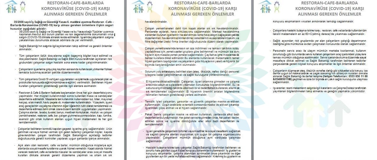 35/2008 sayılı İş Sağlığı ve Güvenliği Yasası 6. maddesi uyarınca Restoran -Cafe - Barlarda Koronavirüse (COVID-19) karşı alması gereken önlemlere ilişkin asgari hususlar aşağıdaki gibidir: