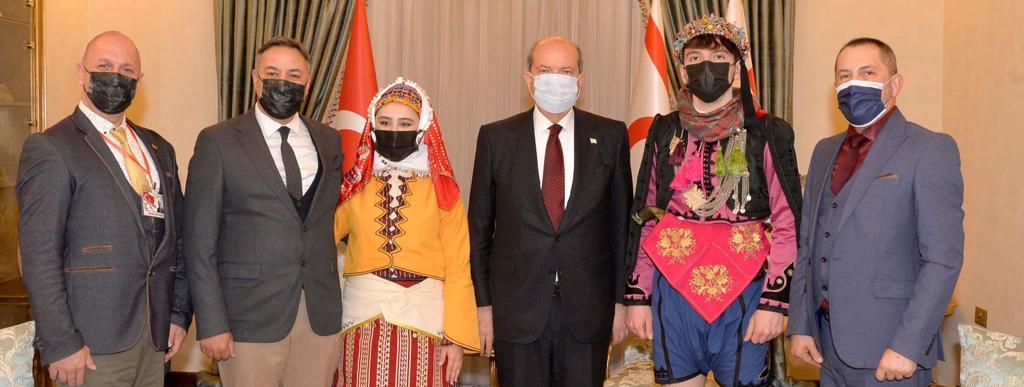 Cumhurbaşkanı Ersin Tatar, Kıbrıs Türk Halk Dansları Federasyonu başkanı ve Çanakkale’den gelen Çanakkale Folklor Araştırma Derneği Gençlik ve Spor Kulübü (ÇAFAD) heyetini kabul ederek görüştü.