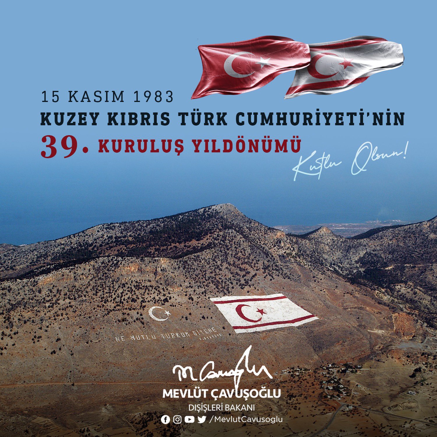 Türkiye Dışişleri Bakanı Mevlüt Çavuşoğlu sosyal medya hesabından yaptığı paylaşımla KKTC’nin 39’uncu kuruluş yıldönümünü kutladı.