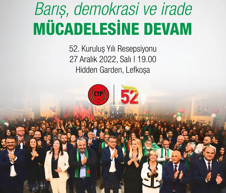Cumhuriyetçi Türk Partisi (CTP) 52’nci kuruluş yıl dönümü vesilesiyle yarın Lefkoşa Hidden Garden’da resepsiyon düzenleyecek.