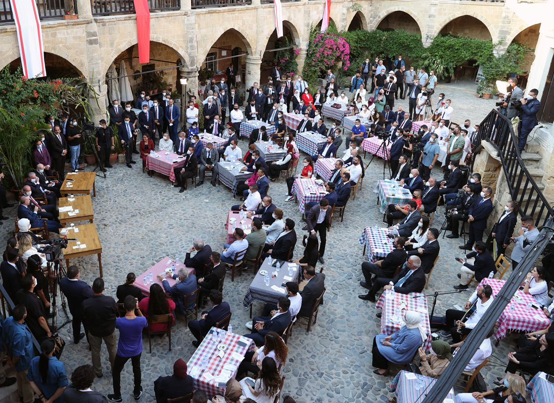 “Hellim peyniri gelmiyor dersek ayıp olur. Şu anda malum Kıbrıs’ın en güçlü kalemlerinden bir tanesi hellim peyniri. Tabii bizim aklımıza 74 geliyor. Çünkü 1974, o mücadele de o savaş da çocukluğumuzun en hareketli çağlarıydı ve buralardaki zafere giden o yolda Doktor Fazıl Küçük, Rauf Denktaş, öbür tarafta Başbakan merhum Ecevit, Başbakan Yardımcısı Erbakan ve bunlarla birlikte milletimizin verdiği mücadele unutulur gibi değildi. Verilen bu mücadele neticesinde de hamdolsun, bu zalim diyeceğim artık, Yunanların elinden kurtarılmış oldu. Bu mücadele ile birlikte adeta dünyada bize karşı Haçlı Seferi zihniyetini yeniden ortaya koymak isteyenlere Türkler olarak büyük bir ders vermiş olduk. O günden aklımda kalan en önemli başlık nedir diye sorarsanız onu da söyleyeyim. Beşparmak Dağları’dır. Şimdi de inşallah yapacağımız külliyeyi de Beşparmak Dağları’na sırtımızı dayayarak, böyle bir yerde yapmayı planladık Sayın Cumhurbaşkanı ile beraber.”