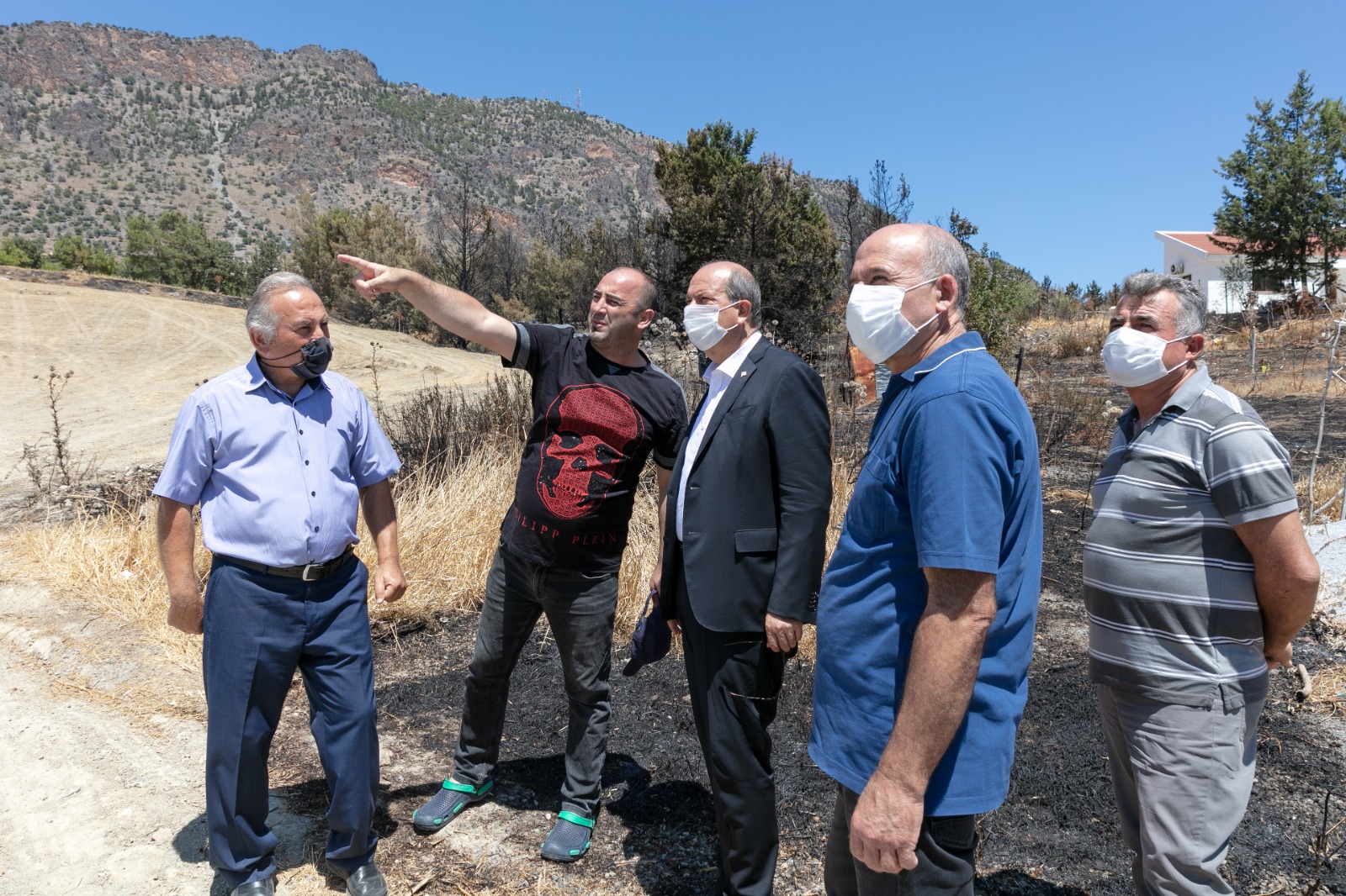 Cumhurbaşkanı Ersin Tatar, Ağırdağ yolunun batı kısmında başlayıp ormanlık alana yayılan yangın yerinde incelemelerde bulundu.