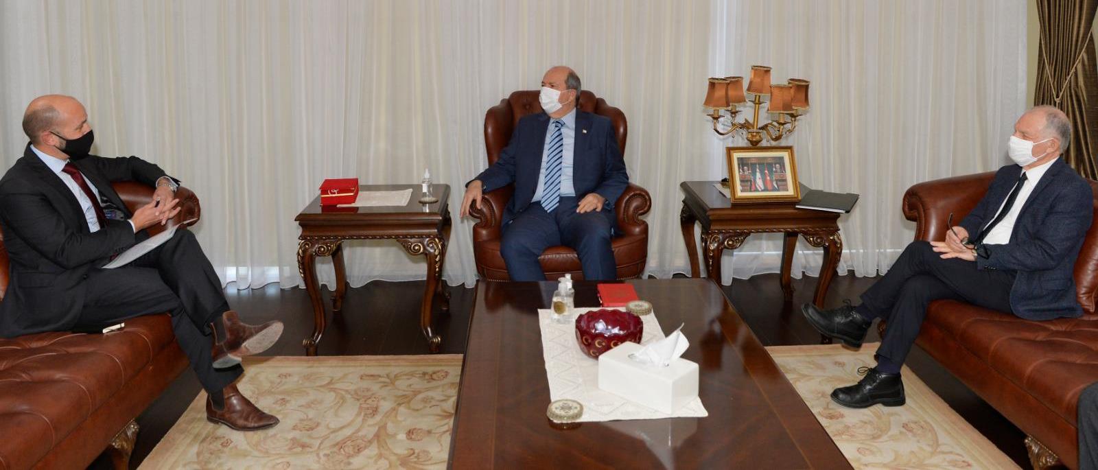 Doğu Akdeniz’de yaşanan gelişmelere değinilen görüşmede Kıbrıslı Türklerin bölgedeki doğal kaynaklarla ilgili meşru haklarına vurgu yapan Cumhurbaşkanı Tatar, uluslararası toplumun bugüne kadar Kıbrıslı Türklere uyguladığı ayrımcılığın ortadan kalkması gerektiğini söyledi. Görüşmede, Cumhurbaşkanı Tatar, Kıbrıs Türk tarafının, Nisan ayı sonunda Cenevre’de gerçekleştirilecek 5 +BM gayrıresmi toplantısına yapıcı ve samimi bir şekilde hazırlandığını muhatabına anlattı.