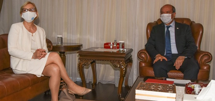 Cumhurbaşkanı Ersin Tatar, bugün, Birleşmiş Milletler (BM) Genel Sekreteri Antonio Guterres’in Kıbrıs’taki Özel Temsilcisi ve Barış Gücü (UNFICYP) Misyon Şefi Elizabeth Spehar’ı makamında kabul etti.