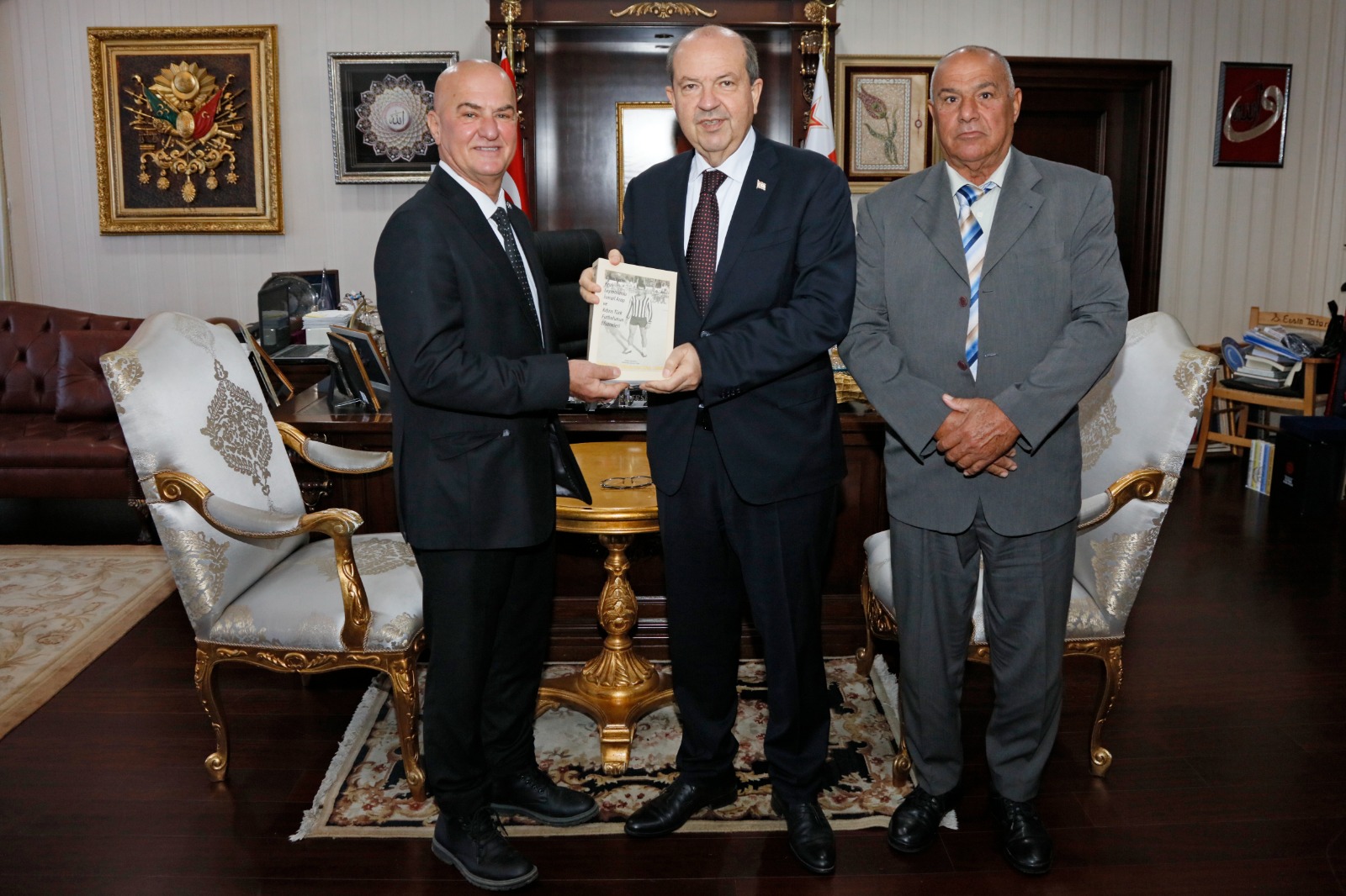 Cumhurbaşkanlığından verilen bilgiye göre, araştırmacı, gazeteci ve yazar Hasan Karaokçu Cumhurbaşkanı Ersin Tatar’a, “Gönüllerin Kralı Leymosunlu İsmail Arap ve Kıbrıs Türk Futbolunun Efsaneleri” isimli kitabını takdim etti.