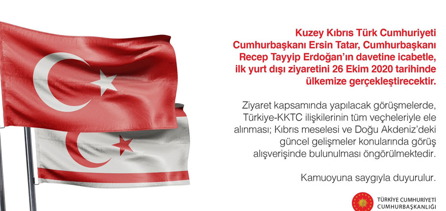 KKTC‘nin 5. Cumhurbaşkanı Tatar, ilk yurt dışı ziyaretini 26 Ekim Pazartesi günü Türkiye’ye gerçekleştirecek. TC Cumhurbaşkanlığı tarafından yapılan açıklamada “görüşmelerde, Türkiye-KKTC ilişkileri, Kıbrıs meselesi ve D.Akdeniz’deki gelişmeler ele alınacaktır” denildi