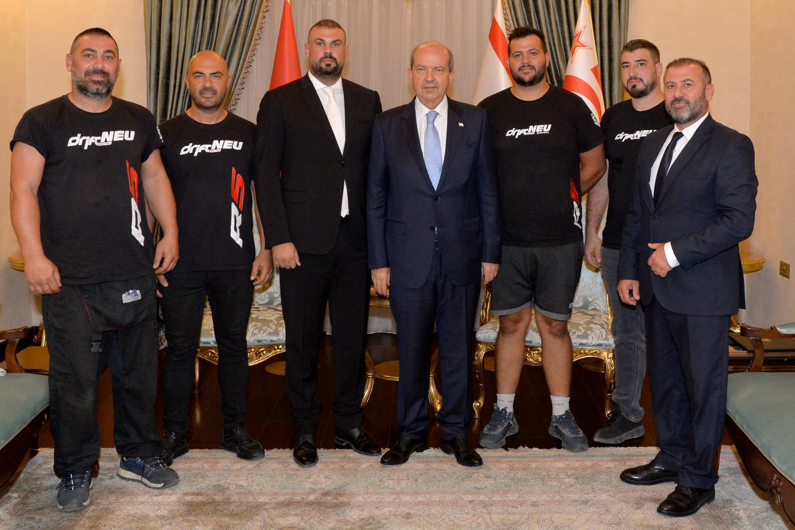 Cumhurbaşkanı Ersin Tatar, KKTC ve Avrupa’da önemli başarılara imza atan NEU Drift Team Pilotu Enver Haskasap ile NEU Drift yarış takımını kabul etti.