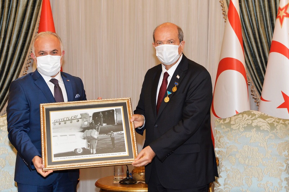 Türkiye Kızılay Derneği heyeti Cumhurbaşkanı Tatar’a, Kıbrıs Barış Harekatı sırasında Türk Kızılayı’nın Ankara’dan Türk Hava Kuvvetleri’ne Kıbrıs Türk halkı için yapılan insani yardımın yüklendiği fotoğrafı hediye etti.