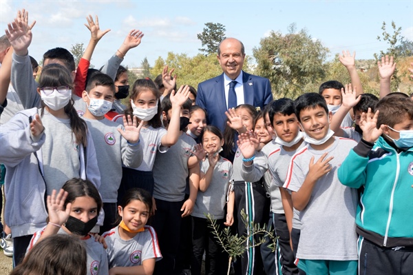 Cumhurbaşkanı Tatar daha sonra, okul bahçesine zeytin fidanı dikerek öğrencilerle sohbet etti.