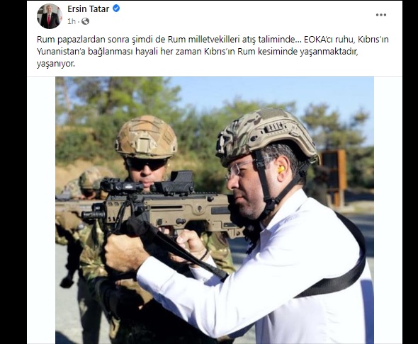 Cumhurbaşkanı Tatar, sosyal medya hesabından yaptığı açıklamada “Rum papazlardan sonra şimdi de Rum milletvekilleri atış taliminde… EOKA’cı ruhu, Kıbrıs’ın Yunanistan’a bağlanması hayali her zaman Kıbrıs’ın Rum kesiminde yaşanmaktadır, yaşanıyor” ifadelerini kullandı.