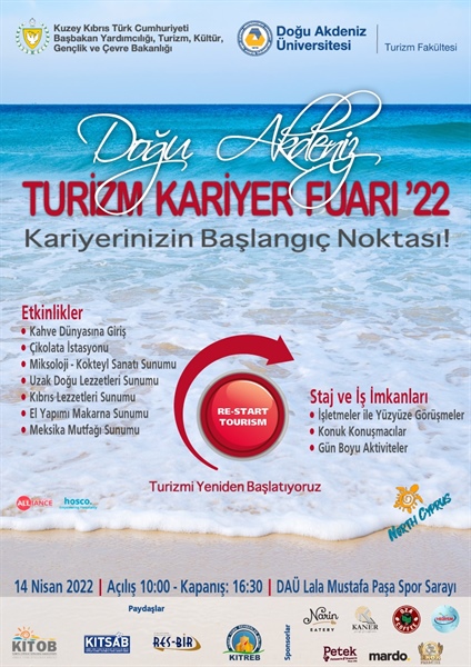 Doğu Akdeniz Üniversitesi (DAÜ) Turizm Fakültesi ile Başbakan Yardımcılığı, Turizm, Kültür, Gençlik ve Çevre Bakanlığı iş birliğinde 14 Nisan Perşembe günü, DAÜ Lala Mustafa Paşa Spor Sarayı’nda “Doğu Akdeniz Turizm Kariyer Fuarı 2022” düzenleniyor.