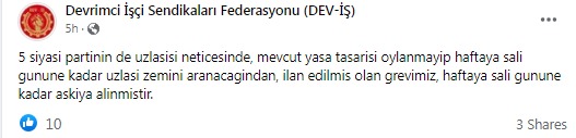Devrimci İşçi Sendikaları Federasyonu (DEV-İŞ)sosyal medya hesabından ; “5 siyasi partinin de uzlaşısı neticesinde, mevcut yasa tasarısı oylanmayıp haftaya Salı gününe kadar uzlaşı zemini aranacağından, ilan edilmiş olan grevimiz, haftaya Salı gününe kadar askıya alınmıştır” şeklinde açıklama yapılarak, bugün BES ile birlikte tüm belediyelerde gerçekleştirilecek eylemin askıya alındığı duyuruldu. SM/BRT