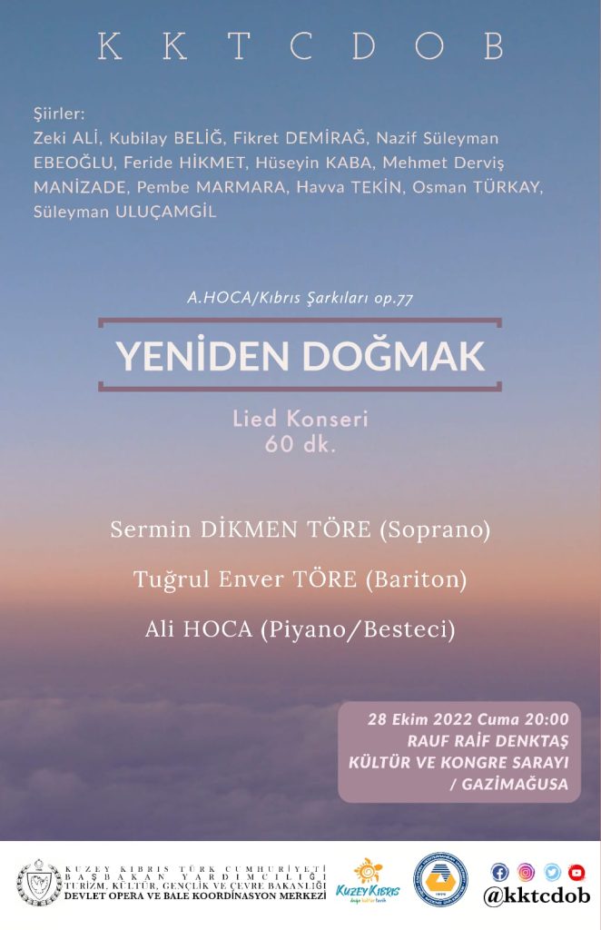 Bakanlıktan yapılan yazılı açıklamaya göre, Kıbrıs Türk Şairleri’nin seçme şiirleri ve besteci Ali Hoca’nın besteleriyle oluşan “Yeniden Doğmak” isimli Lied serisinin Gazimağusa konseri, soprano Sermin Dikmen Töre, bariton Tuğrul Enver Töre solistliğinde ve besteci Ali Hoca’nın piyano eşliğiyle gerçekleştiriliyor.
