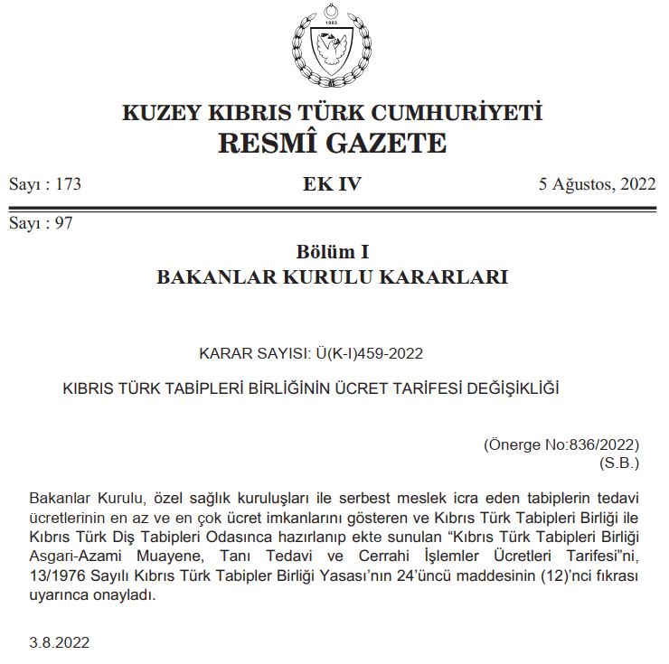 Bakanlar Kurulu, özel sağlık kuruluşları ile serbest meslek icra eden tabiplerin tedavi ücretlerinin en az ve en çok ücret imkanlarını gösteren ve Kıbrıs Türk Tabipleri Birliği ile Kıbrıs Türk Diş Tabipleri Odası’nca hazırlanarak sunulan “Kıbrıs Türk Tabipleri Birliği Asgari-Azami Muayene, Tanı Tedavi ve Cerrahi İşlemler Ücretleri Tarifesi”ni onayladı.
