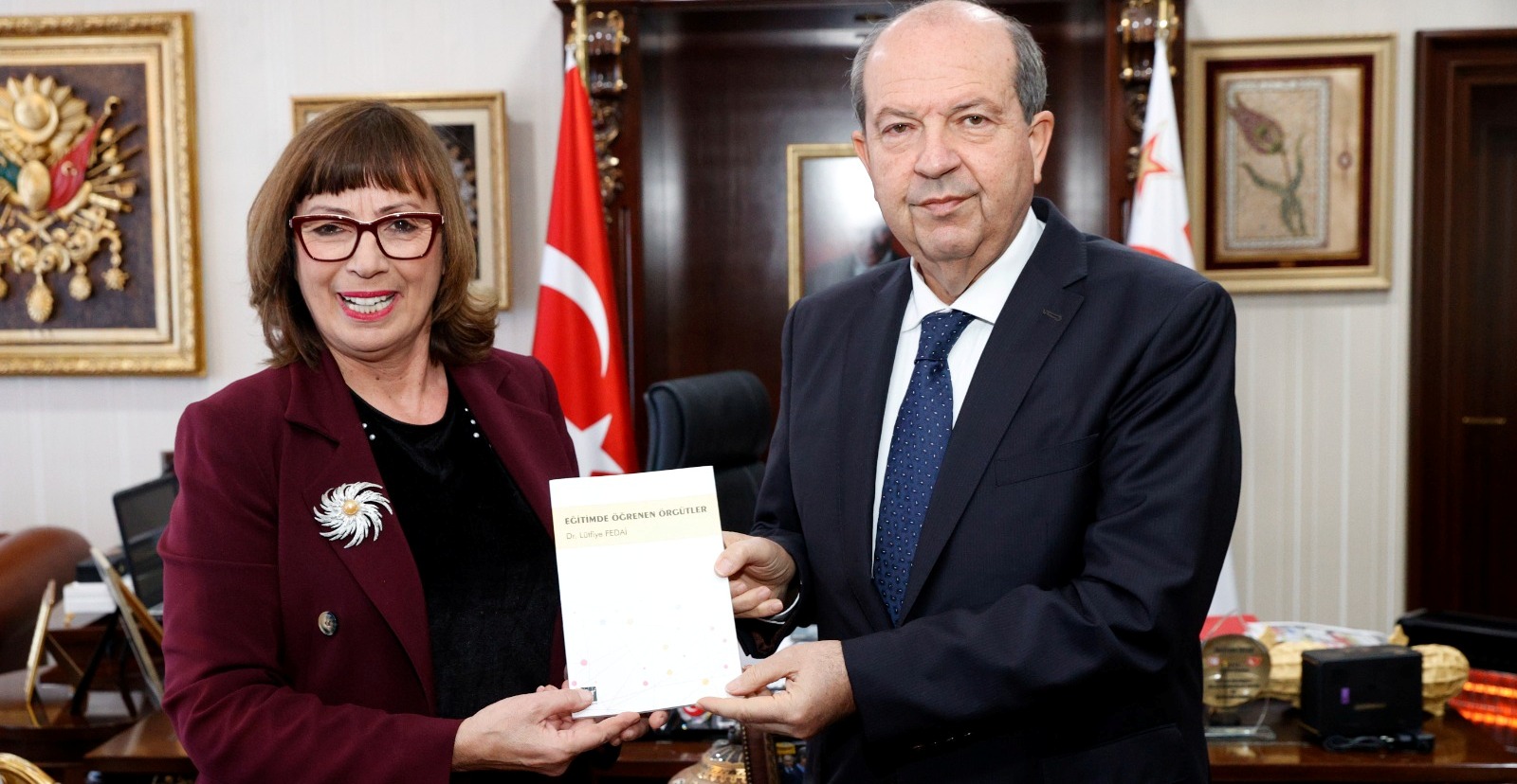 Dr. Lütfiye Fedai, “Eğitimde Öğrenen Örgütler” isimli kitabını Cumhurbaşkanı Ersin Tatar’a takdim etti.