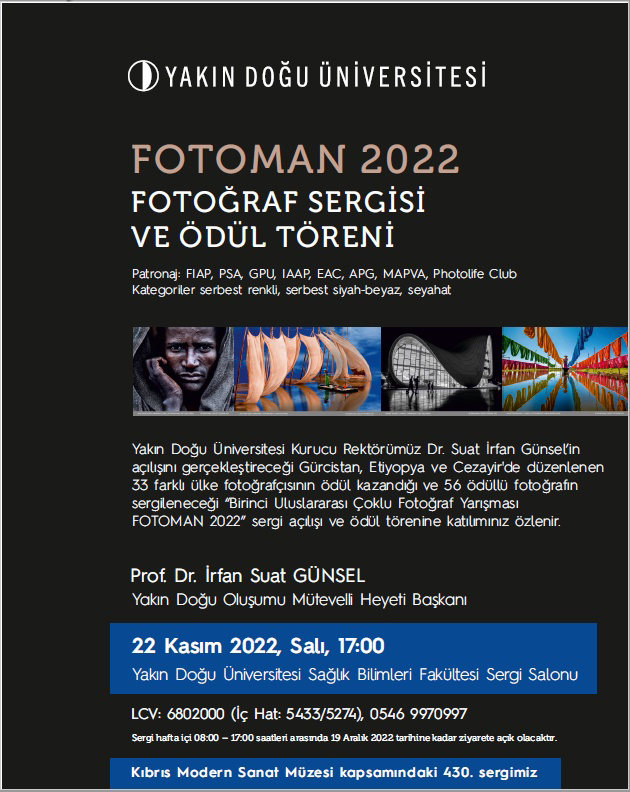 Yakın Doğu Üniversitesi’nde yarın 33 farklı ülke fotoğrafçısının ödüllü 56 fotoğrafının sergileneceği “Fotoman 2022 Fotoğraf Sergisi” açılıyor.