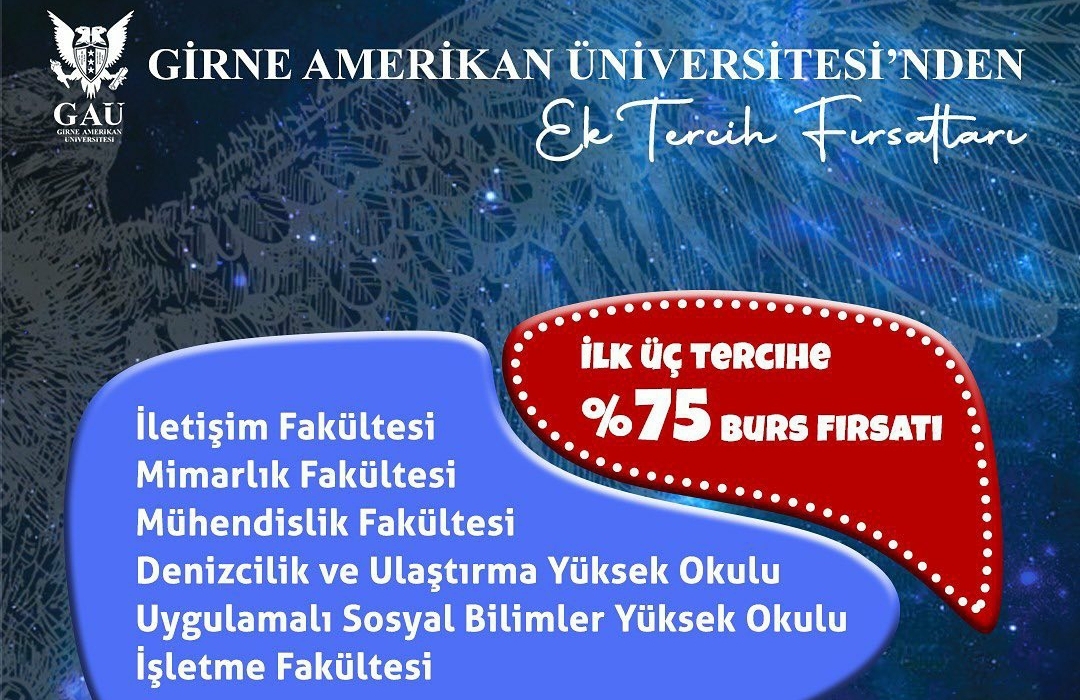 Girne Amerikan Üniversitesi, (GAÜ); ek yerleştirmede GAÜ’yü ilk üçte tercih edecek olan öğrencilere belirlenen bölümlerde %75 burs imkanı sağlanacağını açıkladı.