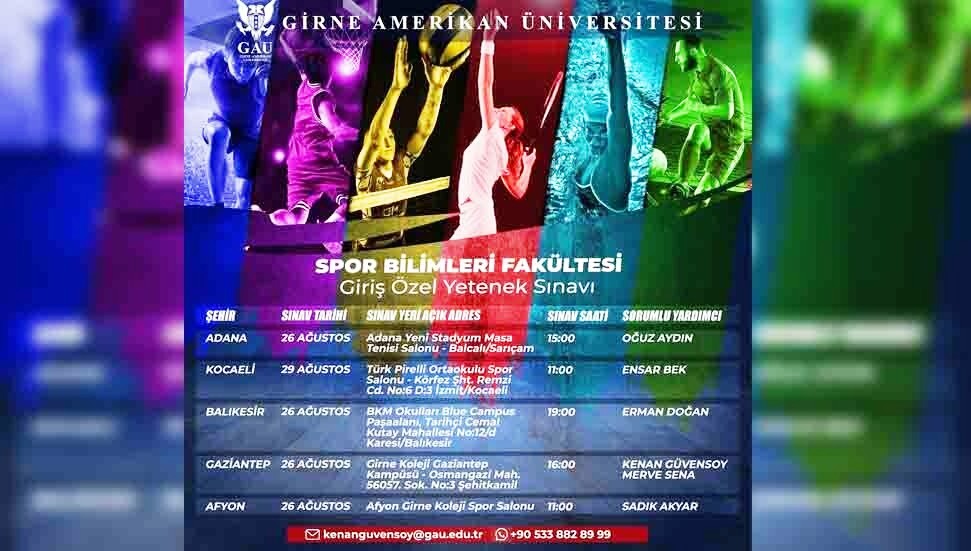 Girne Amerikan Üniversitesi (GAÜ), Spor Bilimleri Fakültesi için Türkiye’nin bazı illerinde “Giriş Özel Yetenek Sınavı” düzenleyecek.