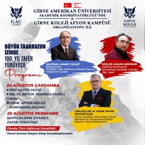 Girne Amerikan Üniversitesi (GAÜ) Akademik Koordinatörlüğü’nde, Girne Koleji Afyon Kampüsü organizasyonu ile “Büyük Taarruzun İzinde 100. Yıl Zafer Yürüyüşü” programı Afyon’da düzenlenecek.