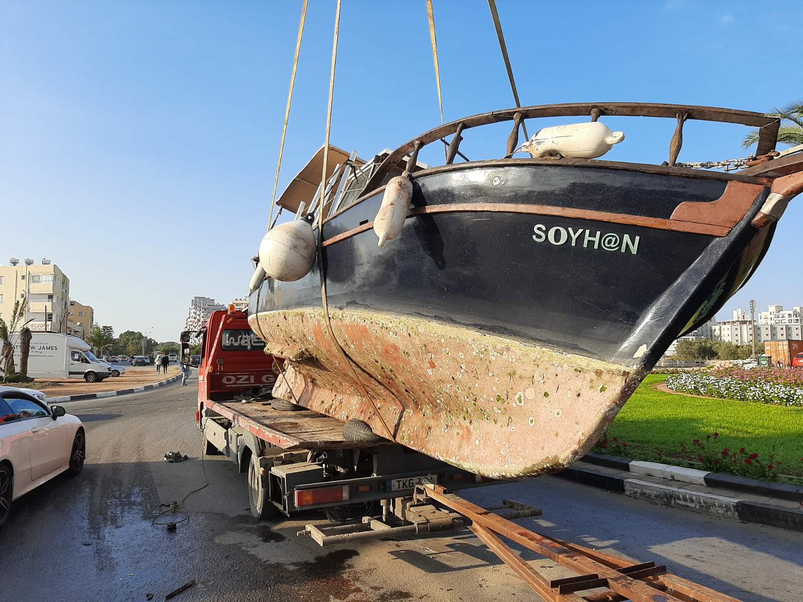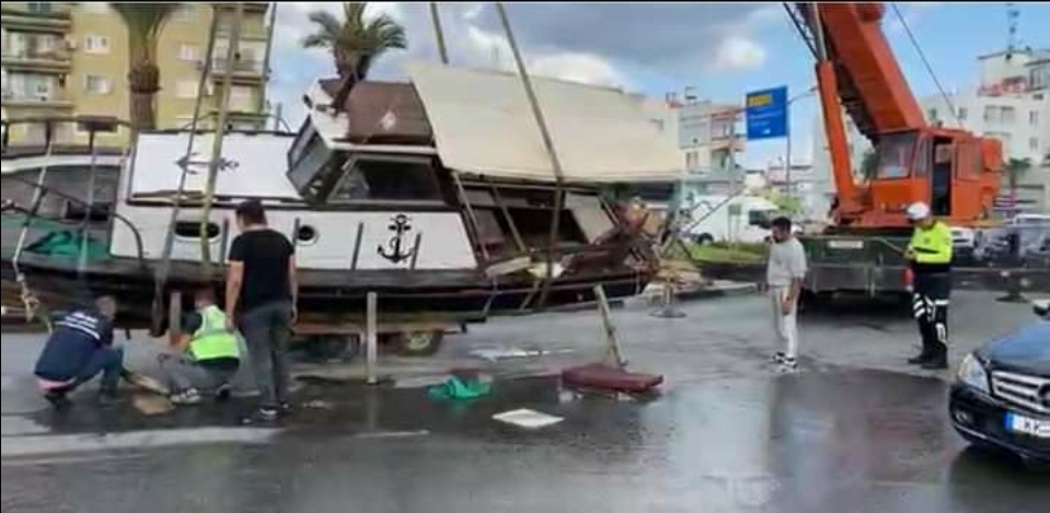 Polis Basın Subaylığı’ndan verilen bilgiye göre Bugün saat 14:00 sıralarında, Gazimağusa’da Mustafa Kemal Bulvarı üzerinde, Dursun Karabatak yönetimindeki TKG 369 plakalı çekici araç ile ayrı bir çekici üzerinde bulunan tekneyi çektiği esnada Hurmalı Çember’e giriş yaptığı sırada çekici demirinin kopması sonucu gemi yol içerisine devrilmiştir.