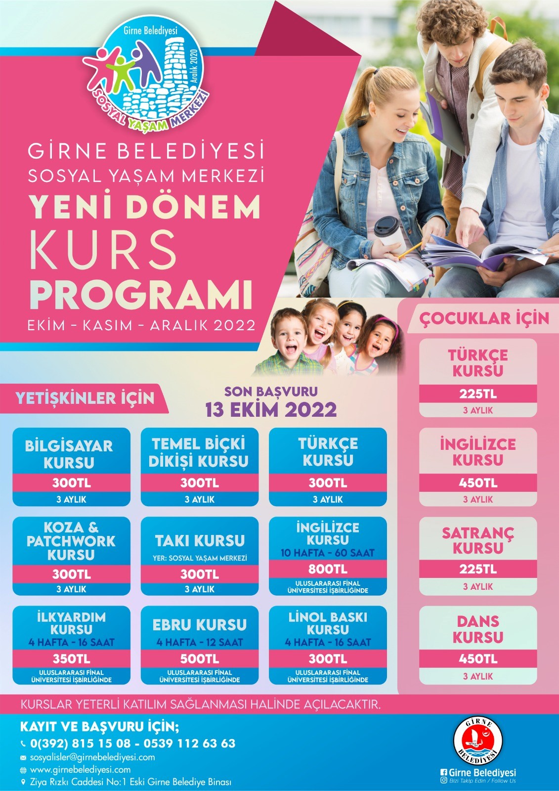 Girne Belediyesi’nden yapılan yazılı açıklamaya göre, yetişkinler için İngilizce, Bilgisayar,Temel Biçki Dikiş, Koza& Patchwork, Takı, Türkçe, Ebru, Linol Baskı, İlkyardım; çocuklar için ise Türkçe, Dans, İngilizce ve Satranç Kursları düzenlenecek.