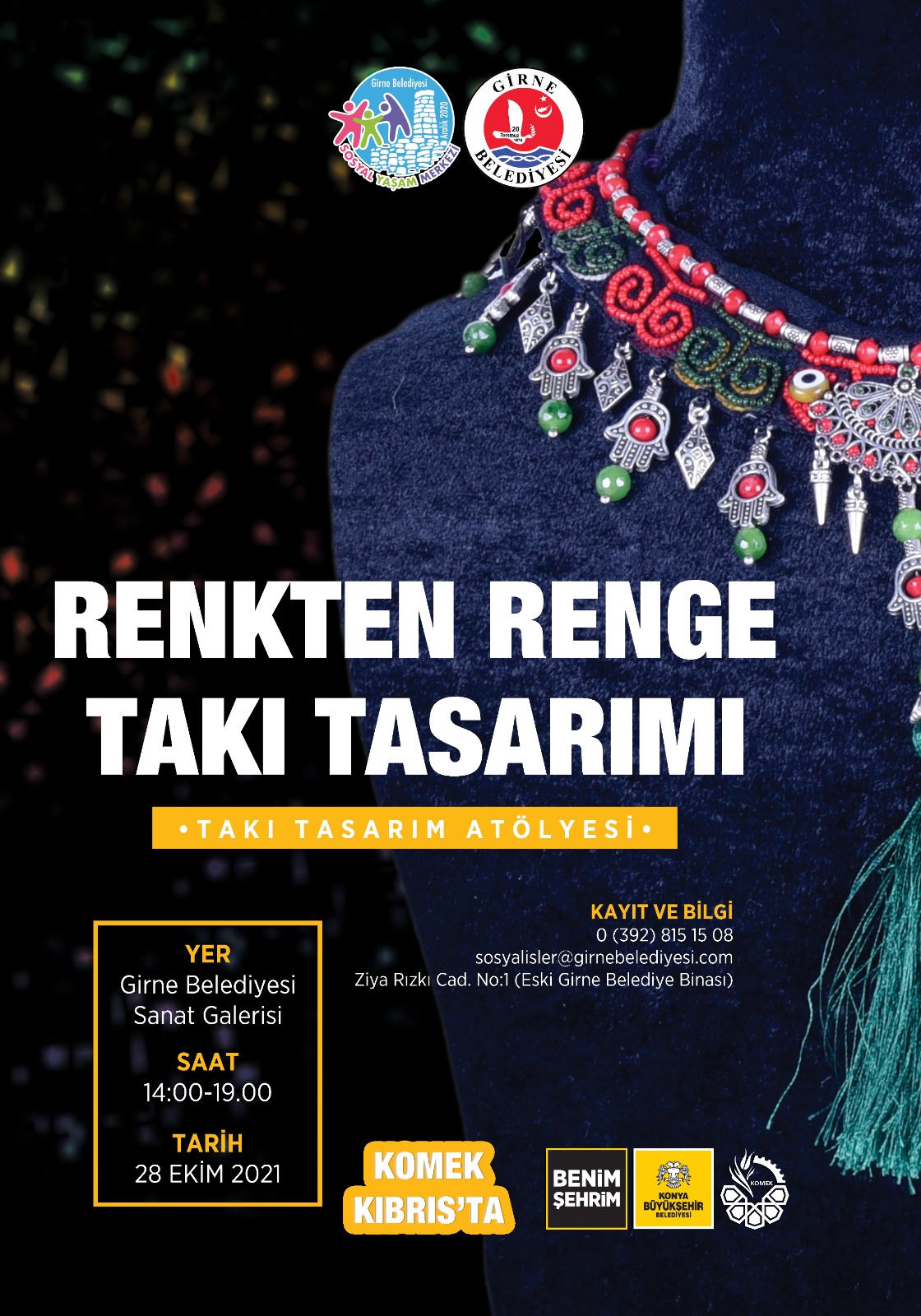 Girne Belediyesi’nin yaptığı açıklamada, Girne Belediyesi Sanat Galerisi’nde yapılacak Takı Tasarım Atölyesi’nin 26 Ekim Salı akşamı, Kâğıt Rölyef Atölyesi’nin 27 Ekim Çarşamba günü ve Filografi Atölyesi’nin 28 Ekim Perşembe günü düzenleneceği belirtildi.