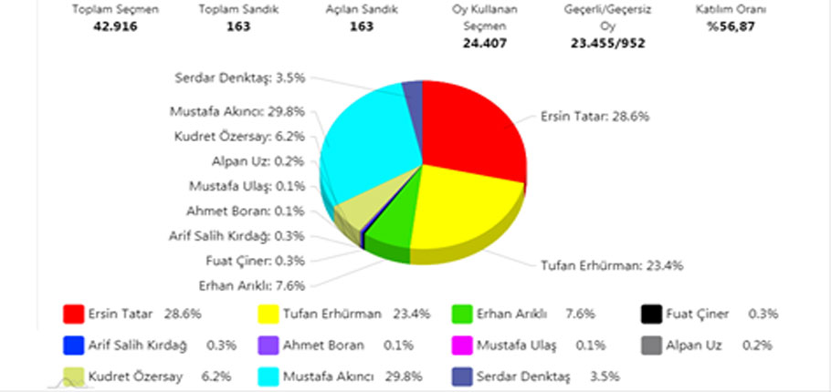 Girne’deki 163 sandıkta 24,407 seçmen oy kullandı. Geçerli oy sayısı 23,455, geçersiz oy 952 oldu. Seçime katılım oranı yüzde 56,87’de kaldı. Bağımsız aday Mustafa akıncı Girne’deki yarışı önde tamamladı.
