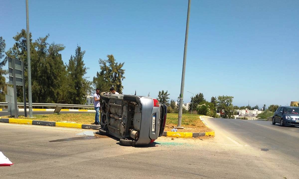 Polis Basın Subaylığı’ndan verilen bilgiye göre bugün  saat 12:30 sıralarında Girne’de  Ecevit caddesi üzeride güney istikametine doğru seyredenGirne’dee sakin Ahmet Demirelişçi (E-25) yönetimindeki FY 544 plakalı Toyota marka araç sürücüsünün dikkatsizliği  sonucu sağa meyilli viraja girdiği zaman direksiyon hakimiyetini kaybedip yolu ikiye ayıran refüje çarptıktan sonra kontrolden çıkarak refüj içerisinde bulunan karayollarına ait çember levhasına aracının ön kısmı ile çarptıktan sonra takla atarak sol yan kısmı üzerinde önü kuzey istikametine bakar şeklinde durmuştur. Kaza sonucu yaralanan olmamıştır.. Kazada FY 544 plakalı araca 15.000 TL, levhaya ise 500 Tl tahmini hasar oldu. Polisin olayla ilgili soruşturması devam etmektedir.