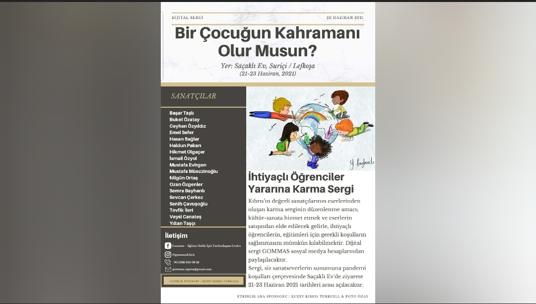 Kıbrıslı sanatçıların eserlerinden oluşan serginin amacı, kültür-sanata hizmet etmek ve eserlerin satışından elde edilecek gelirle ihtiyaçlı öğrencilerin eğitimleri için gerekli koşullar sağlamak…