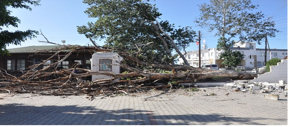 Güzelyurt Belediyesi’nden verilen bilgiye göre, Festival Parkı’nda bulunan Ahşap Büfe’nin damına ve arkasındaki çevre duvarına devrilen ağaç zarara neden oldu.