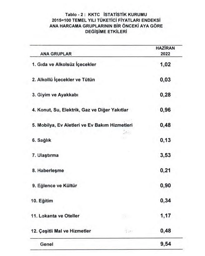Ana harcama grupları itibariyle bir önceki aya göre en yüksek artış yüzde 21.68 ile “ulaştırma” ana grubunda yaşandı. “Lokanta ve Oteller” ana grubunda yüzde 15.28, “Çeşitli Mal ve Hizmetler” grubunda yüzde 7.79, “Eğlence ve Kültür” grubunda yüzde 7.66, “Giyim ve Ayakkabı” grubunda yüzde 7.33, “Mobilya, Ev Aletleri ve Ev Bakım Hizmetleri” grubunda yüzde 6.79 artış meydana geldi.