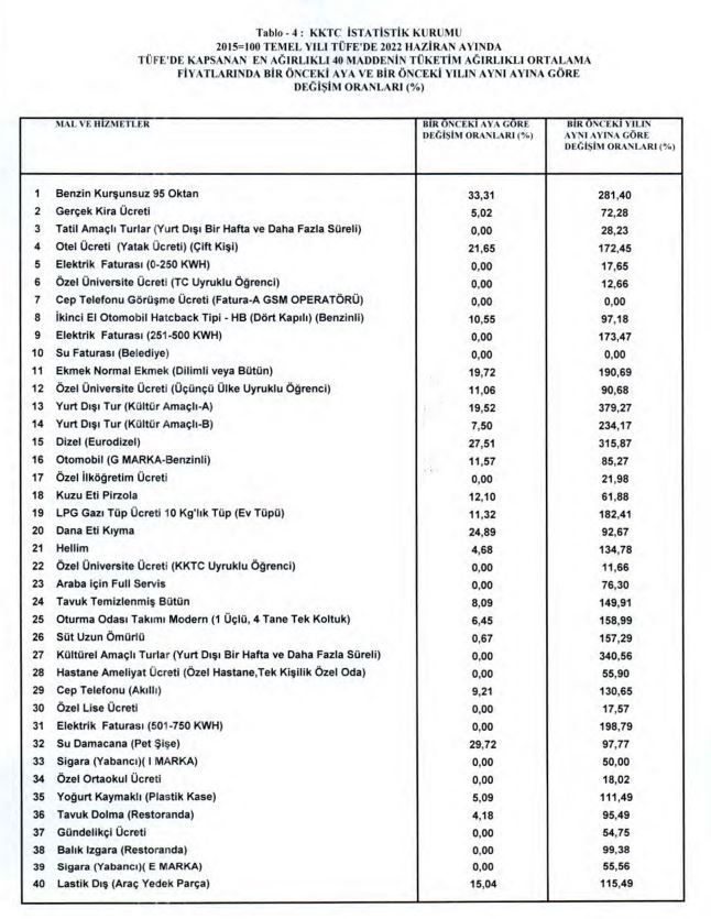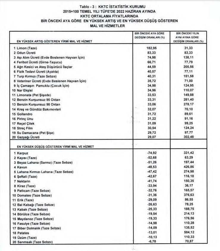 Bir önceki aya göre, endekste kapsanan 562 maddenin ortalama fiyatlarında artış, 32 maddenin ortalama fiyatlarında ise düşüş yaşandı.En yüksek fiyat artışı gösteren ilk üç mal yüzde 182.95 Limon, yüzde 83.33 Odun Ücreti ve yüzde 74.98 evde beslenen hayvanlar içinAşı Alım Ücreti oldu.