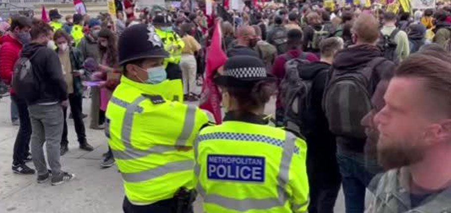 Binlerce gösterici sloganlar atarak Londra caddelerinde yürürken maske ve mesafe kuralına uyulup uyulmadığında odaklanan polis, göstericileri uzaktan izledi.