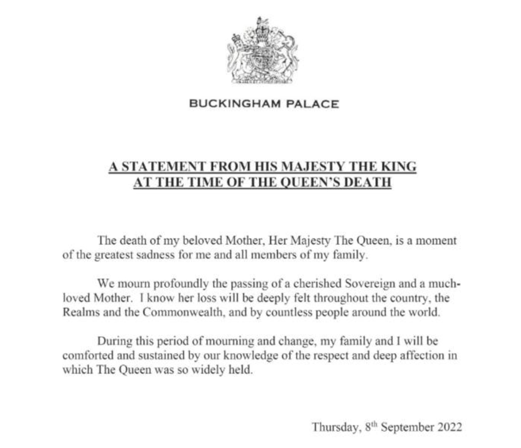 İlanda İngiliz kraliyet ailesinin “Kraliçe bu öğleden sonra Balmoral’da huzur içinde yaşamını yitirmiştir. Kral ve eşi kraliçe bu akşam Balmoral’da kalacak ve yarın Londra’ya döneceklerdir.” şeklindeki mesajı yer aldı.