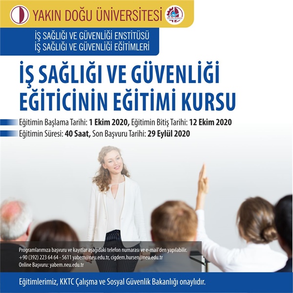 Yakın Doğu Üniversitesi Basın ve Halkla İlişkiler Müdürlüğü’nden yapılan açıklamaya göre, Yakın Doğu Üniversitesi İş Sağlığı ve Güvenliği Enstitüsü tarafından verilecek “İş Sağlığı ve Güvenliği Eğiticinin Eğitimi Kursu” 6-16 Ekim 2020 tarihleri arasında gerçekleştirilecek.