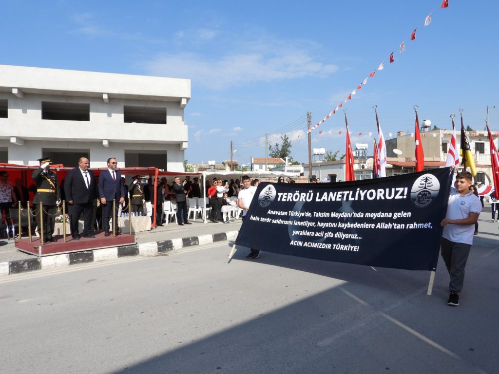 İskele Belediyesi, KKTC’nin 39. kuruluş yıldönümü kutlamaları çerçevesinde İskele’de düzenlenen törenlerde pankart açarak, terörü lanetledi ve Türkiye’ye destek belirtti.