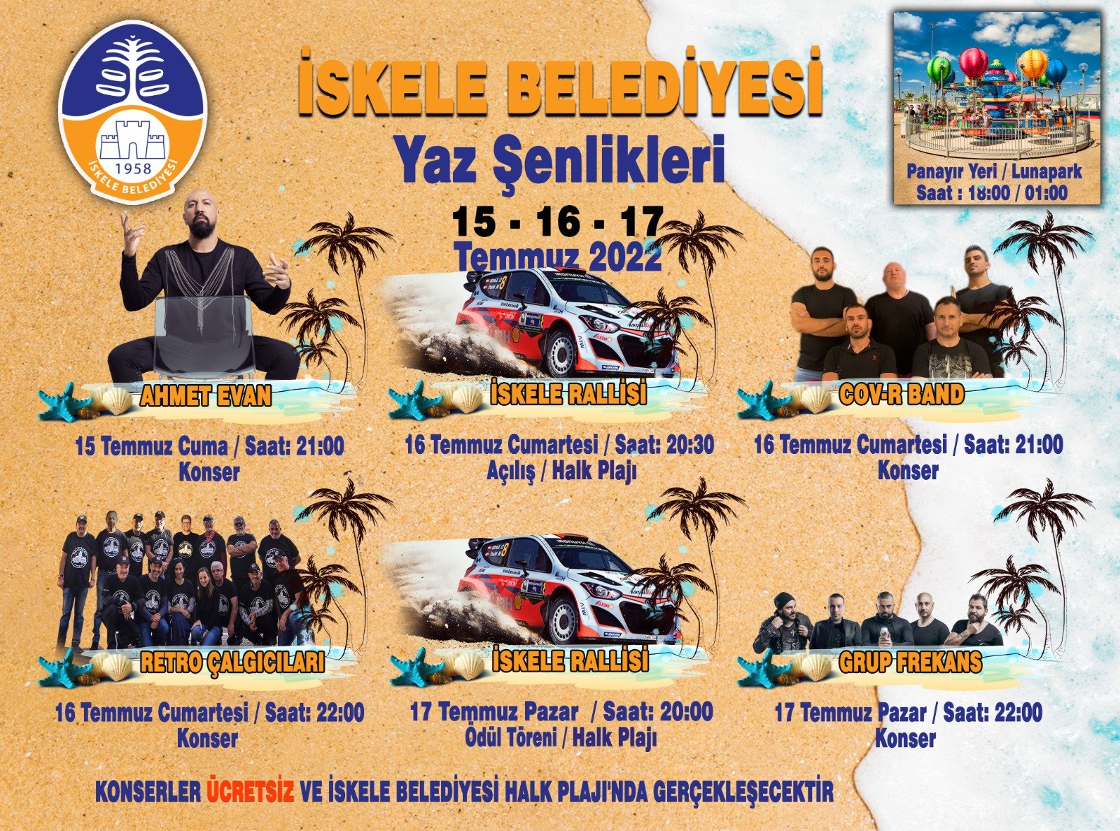 İskele Belediyesi Halk Plajı’nda düzenlenecek İskele Belediyesi Yaz Şenlikleri 3 gün boyunca 4 konsere ev sahipliği yapacak. 15 Temmuz Cuma saat 21.00’da Ahmet Evan’la başlayacak konserler, 16 Temmuz Cumartesi 21.00’da Cov-r Band, saat 22.00’da ise Retro Çalgıcıları ile devam edecek. Yaz Şenliklerinde, 17 Temmuz Pazar günü ise final konserinde saat 22.00’da Grup Frekans sahne alacak